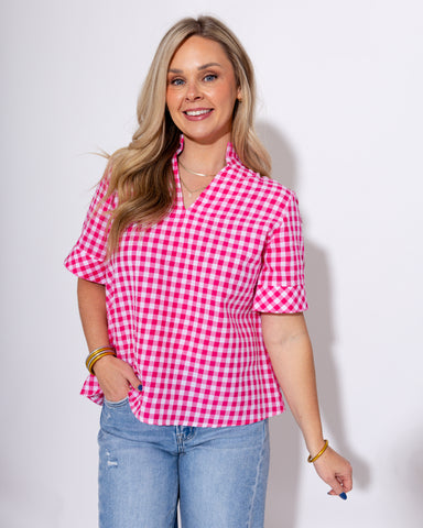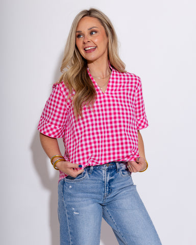 Elevate your everyday wardrobe with this hot pink gingham checkered top, designed for effortless sophistication. The charming split neckline draws ...