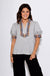 Elevate your everyday wardrobe with this sophisticated heather grey top, designed to blend timeless elegance with modern flair. The notched V-neckline flatters while the charming puff sleeves add a touch of refined femininity. A striking plaid contrast accent provides visual interest, while the standing neckline and pleated back detail create dimension and movement. Perfect for layering or wearing solo, this versatile piece transitions seamlessly from office to weekend gatherings. Crafted for those who appreciate quality basics with personality, it's the foundation piece every style-conscious wardrobe deserves.
