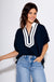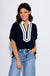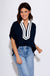 Elevate your everyday wardrobe with this sophisticated navy top, designed with striking white contrast detailing that frames the split neckline and cascades down the front. The high neckline offers refined coverage while the crisp white trim creates a polished, intentional look that transitions seamlessly from day to evening. Perfect for layering or wearing solo, this piece combines timeless elegance with modern styling versatility. A wardrobe essential that delivers both comfort and understated luxury.