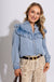 Elevate your everyday look with this snow-washed denim button-down top, featuring delicate ruffle details along the front placket and collar. Softly faded for a vintage-inspired feel, this top combines casual charm with a touch of feminine sophistication. Perfect for layering or wearing solo, it pairs effortlessly with jeans, skirts, or shorts for a versatile wardrobe staple.