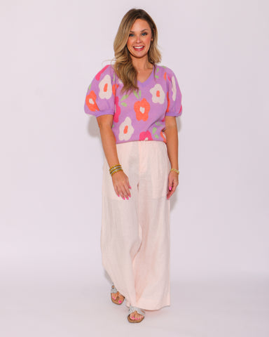 Floral Pattern Puff Sleeves V-Neck Sweater in Lavendar