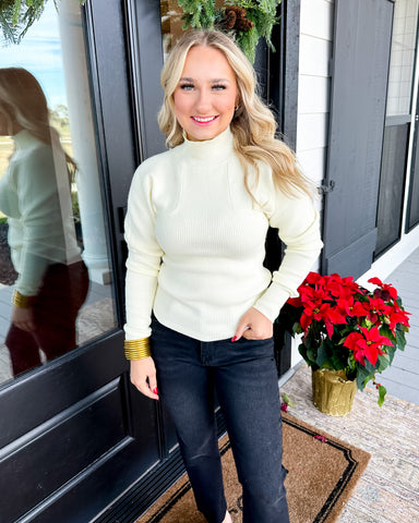 View full details+ Ribbed mock neck sweater + Mock neckline + Fitted bodice + Ribbed knit throughout + Shirring detail + Drop shoulder with long cuffs
