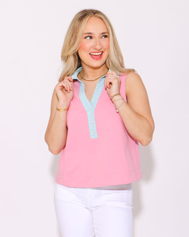 Unleash your sweet and stylish side with our Sweet and Striped Tank. The solid jersey knit and contrast spread collar add a touch of sophistication...