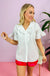 SHORT SLEEVES, RUFFLE BANDED NECKLINE.