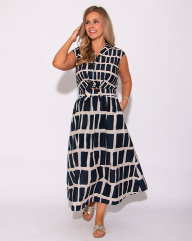 Effortlessly chic and versatile, the Abstract Drift Navy Midi Dress boasts a vibrant abstract print, trendy collar button front with knot closure, ...