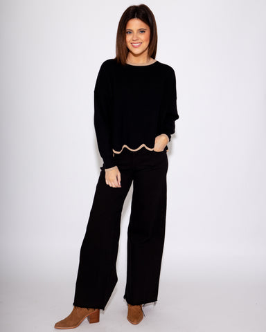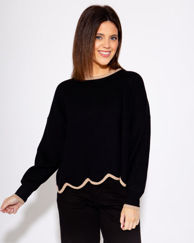Elevate your wardrobe with this charming Contrast Scalloped Sweater Top. The classic black knit pairs beautifully with delicate light mocha scallop...