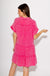 Embrace the airy charm of this Pink Tiered Babydoll Dress! The textured gauze fabric, collared V-neckline, and rolled short sleeves create a feeling of effortless breeziness. The tiered construction adds a touch of playfulness to this mini dress. Perfect for warm weather and casual outings. Not lined.