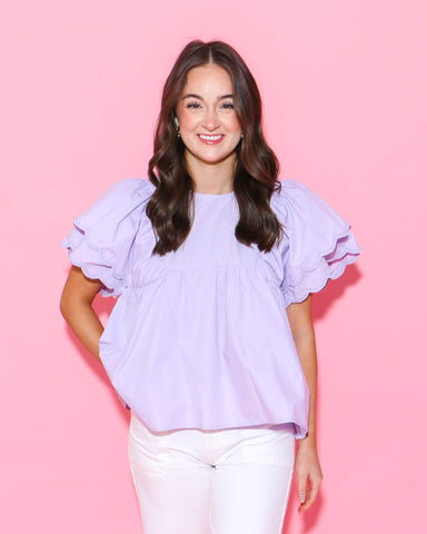 View full detailsGet ready to strut your style in this Scallop Hem Sleeve Top in Lavender! With its playful two layer wide sleeves and a cute slit at the back, you'...