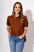 Elevate your wardrobe with The Ruffle Stripe Knit Top, designed with solid knit fabric and stylish puff shoulders for a flattering silhouette. Its short sleeves are accented by contrast striped ruffle bands at the neck and cuffs, adding a playful yet sophisticated touch. Perfect for both casual outings and dressier occasions, this top combines comfort with eye-catching detail to keep you looking effortlessly chic.