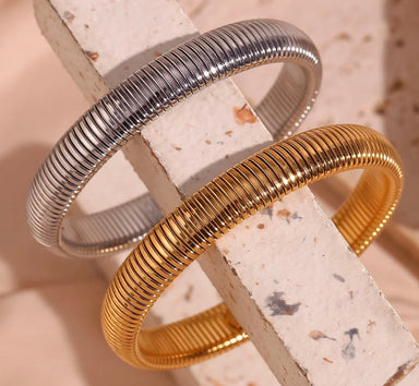 No reviews$ 26.00| /Indulge in luxury with our Gold Triple Hoop Huggie in Rhodium. This stunning piece features three sleek, gold hoops that hug your earlobe for a chi...