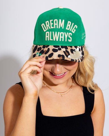 Chase your dreams in style with the Dream Big Always Hat. This standout cap features soft green corduroy, a leopard print bill, and green embroider...