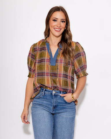 Bring a touch of playful sophistication to your wardrobe with this Puff Sleeve Plaid Top. Featuring a soft olive background with pops of purple, pa...