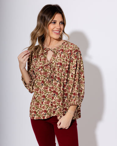 Channel timeless charm with this cream corduroy blouse, adorned with a delicate red floral print. Vertical pintuck pleating on the bodice adds subt...