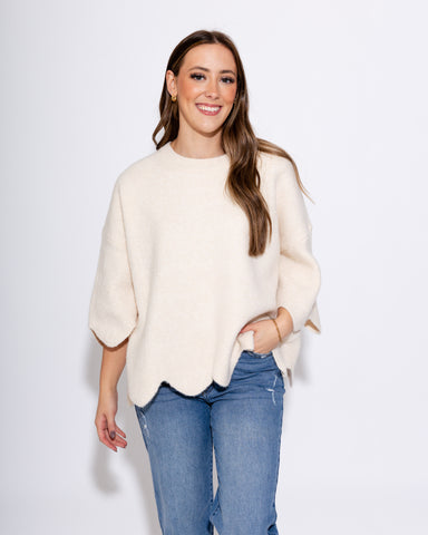 Elevate your everyday look with this sweet and simple scallop knit pullover. Designed with a relaxed fit, ¾ sleeves, and a delicate scalloped hem, ...