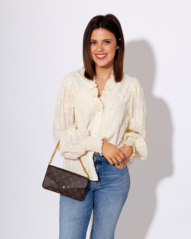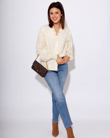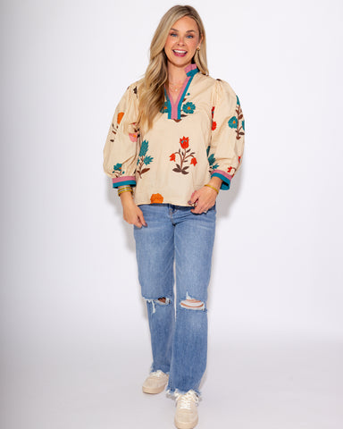 Embrace effortless elegance with this cream-colored floral applique embroidered top. Featuring long puff sleeves with smocked ruffle cuffs, a ruffl...
