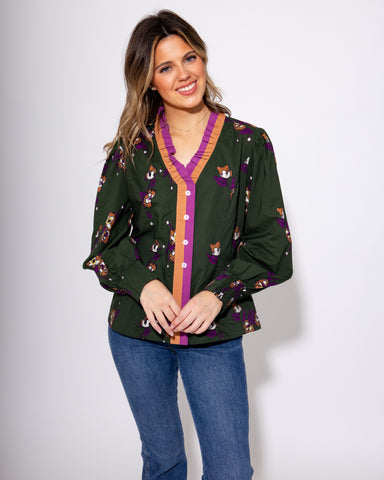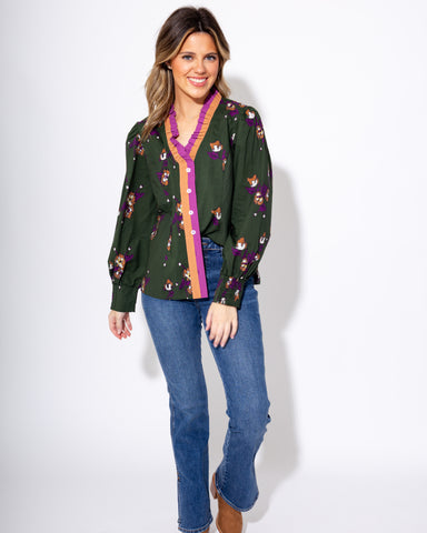 Bring a touch of elegance to your everyday wardrobe with this button-down blouse. Featuring a vibrant abstract floral bunch print in olive, purple,...