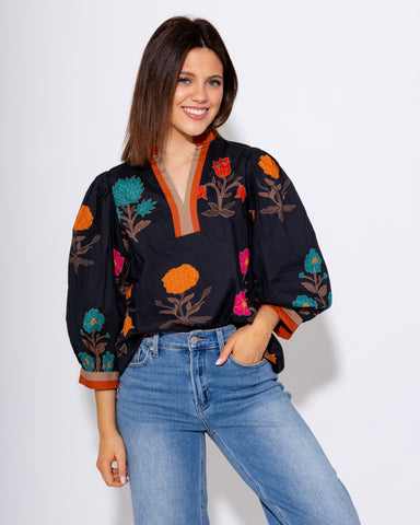 Embrace effortless elegance with this chestnut-colored floral applique embroidered top. Featuring long puff sleeves with smocked ruffle cuffs, a ru...
