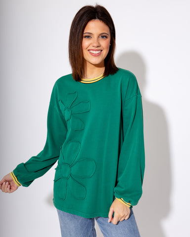 Elevate your style with the Hunter Green Floral Patch Top, featuring a distinctive yellow stripe neck band that adds a vibrant contrast. This uniqu...
