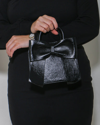 View full detailsElevate your style with our Metallic Bow Front Top Handle Clutch Bag! This sleek and chic bag features a metallic finish and a statement bow detail...
