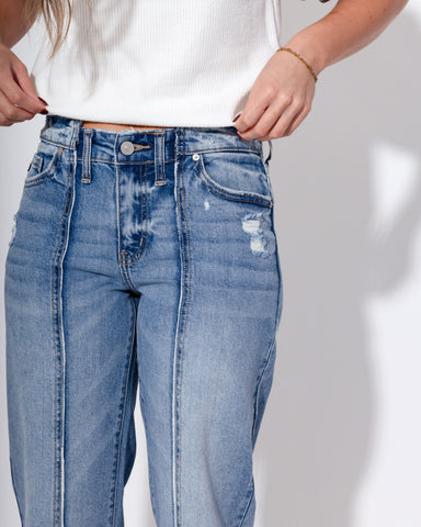 Elevate your everyday style with these Mid Rise Barrel Double Roll Up Jeans in a versatile dark wash. The trendy barrel silhouette and playful doub...