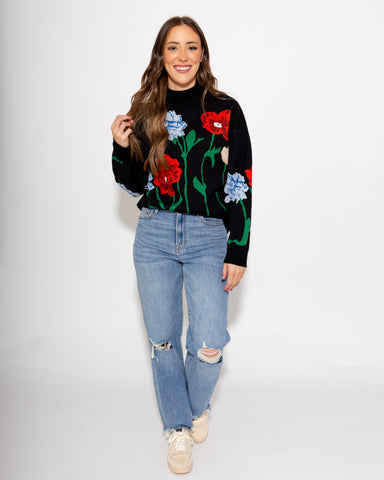 Make a bold statement with this striking black top featuring oversized floral artwork that commands attention. Vibrant red blooms pop against the d...
