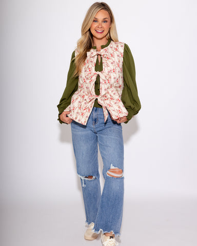 A cozy-meets-cute moment you’ll reach for again and again. This floral quilted vest features a cream backdrop adorned with dainty pink and red bloo...