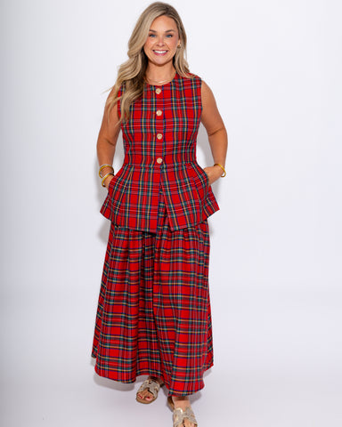 Elevate your layering game with this sleek sleeveless vest top in classic red plaid. Tailored for a flattering fitted silhouette, it features elega...