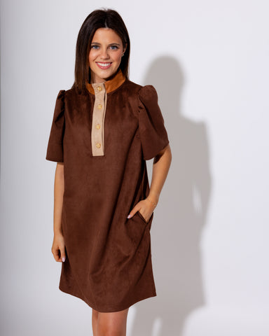 This brown suede mini dress combines elegance and charm with its four gold braided buttons cascading down from the neckline. A subtle light tan sue...