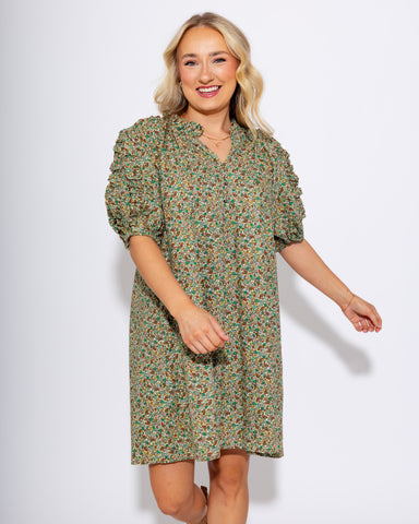 View full detailsStep into effortless charm with this short sleeve mini dress, featuring a delicate floral print in shades of green and brown. The V-neckline and bu...