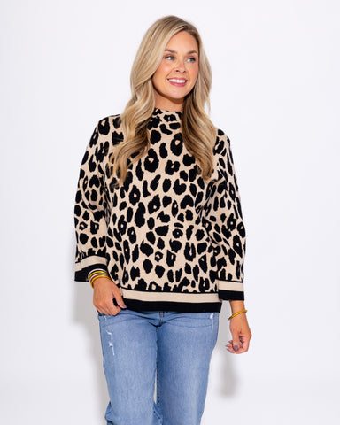 This leopard print ¾ sleeve sweater knit combines bold style with cozy comfort. Featuring a chic mock neck and contrasting black ribbed hem and cuf...