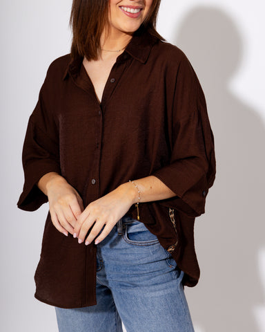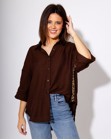 Classic meets bold in this brown ¾ sleeve top, designed with a sleek silhouette and unexpected pops of personality. Eye-catching animal print trim ...