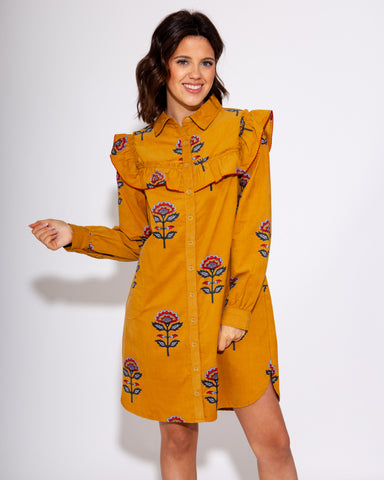 Brighten your wardrobe with the Ivy Jane Ruffled Yoke Shirt Dress in a rich mustard-gold floral print. Designed with a collared neckline, button-do...