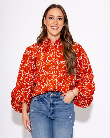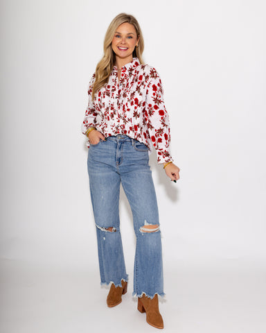 Effortlessly chic and beautifully detailed, the Ivy Jane Tuxedo Gauze Top features an ivory background adorned with warm red and brown florals. Des...