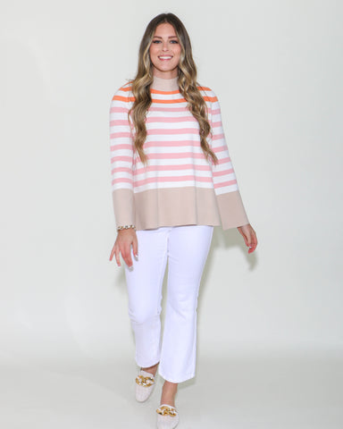 Discover timeless elegance with our Stripe Mock Neck Bell Sleeve Tunic Sweater. This stylish piece features a mock neck for a sophisticated look an...