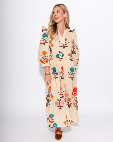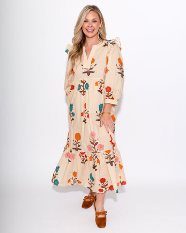 Embrace bohemian beauty in our Floral Print Border Midi Dress! With its vibrant, embroidered flowers and relaxed, tiered silhouette, this sleeveles...