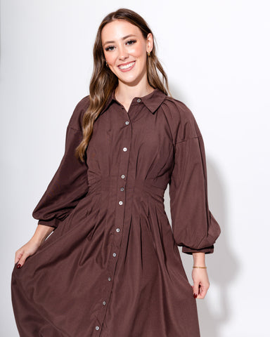Understated sophistication defines the Everyday Elegance Pleated Midi. Crafted in a rich brown hue, this woven beauty features long sleeves, a butt...