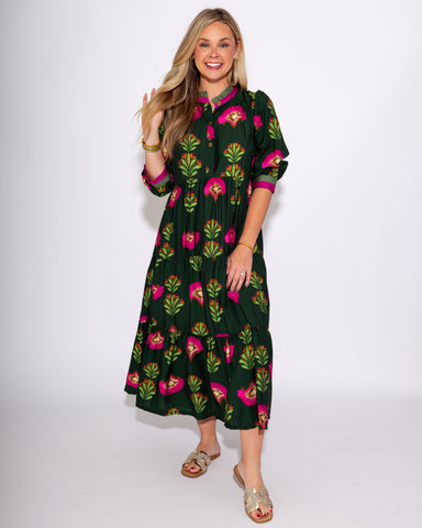 Timeless elegance meets effortless style in this pullover midi dress, set against a rich green background that beautifully showcases a framed flora...