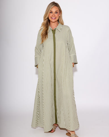 Chic, simple, and endlessly versatile—the Olive Stripe Everyday Midi is a wardrobe staple you’ll reach for again and again. Designed with a crisp s...