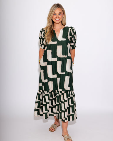 Effortless elegance meets everyday wear in the Hunter Green Print Midi Dress. Designed with charming short puff sleeves and a flattering V-neckline...