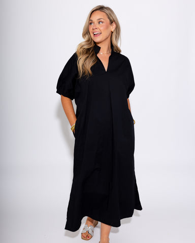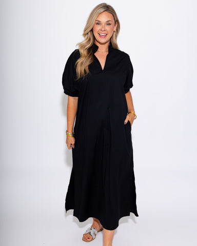 Effortlessly chic, this solid black midi dress is designed with short puff sleeves, a band collar, and a flattering V-neckline. Side slits and pock...