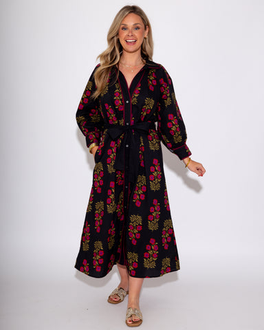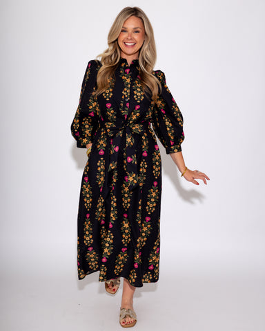 Step into effortless elegance with the Black Floral Button-Down Midi Dress. Featuring a collared neckline, button-front closure, and self-tie waist...
