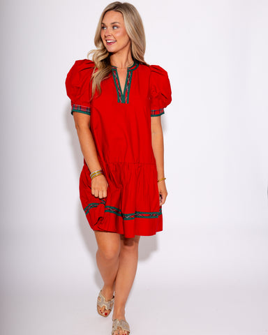 Playful yet polished, this solid red mini dress is accented with charming green plaid trim along the neckline, cuffs, and hem. Featuring puff sleev...