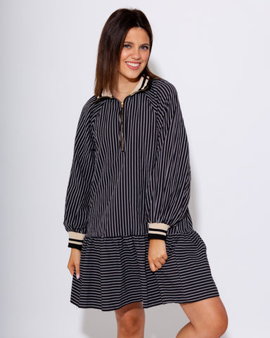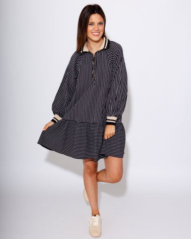 Step into effortless style with this striped long sleeve mini dress. Designed with a ribbed collar and front zipper closure for a sporty-chic vibe,...