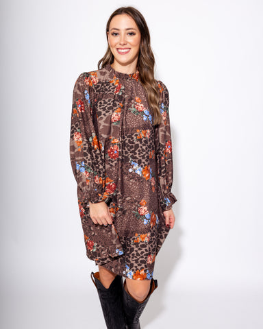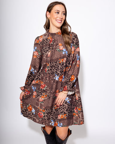 Vintage charm meets everyday ease in this floral print mini dress, designed with a rich brown backdrop and soft pops of pink, green, and sun-washed...
