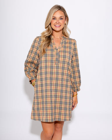 This taupe checker dress features elegant 3/4 puff sleeves and a flattering V neckline, combining classic style with a modern twist. Designed with ...