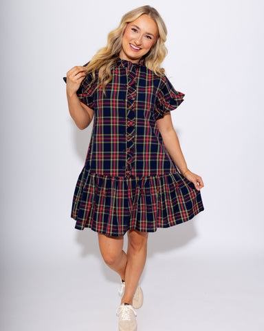 Playful yet polished, this navy plaid mini dress is a fall favorite. Designed with a button-front closure, ruffle accents, and a flouncy ruffle hem...