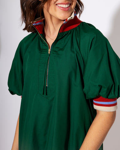 Feminine with a bold twist—this rich hunter green mini dress features statement puff sleeves and a playful ruffle hem, balanced by a sleek zip-fron...