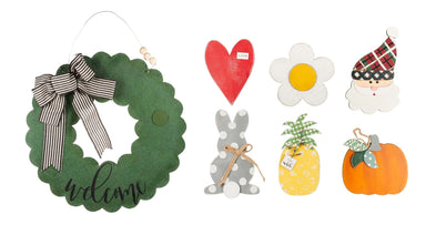 View full detailsThis new seasonal burlee is ideal for a year-round decorator! The various wood pieces magnetically adhere to the upper right hand side of the wre...