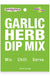 Natural Garlic and Herb Dip Mix has just the right amount of garlic and a perfect blend of herbs that is sure to complement any occasion! Great for dipping vegetables, chips, crackers or bread, this savory dip will quickly become a family favorite. Try creating delicious garlic bread in minutes with the help of this mix, or add dry mix to olive oil to make a savory dipping oil for freshly baked bread.