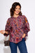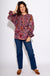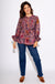 The Ivy Jane Tucked Bib Top features a rich grape-colored background accented with bright yet subtle floral pops, creating a fresh and elegant look. Its delicate small ruffle neck and gentle ruffle details add feminine charm, while the three-quarter button closure at the top offers easy wear and a touch of sophistication. Perfect for adding a stylish, graceful element to your wardrobe, this top pairs effortlessly with both casual and dressy outfits.